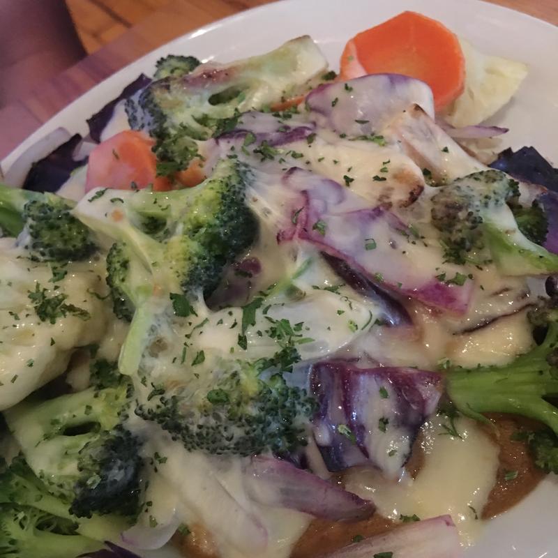 Grilled broccoli, cauliflower, carrots, onions, & red cabbage over brown rice, melted monty jack cheese, cafe golden gravy (VG)